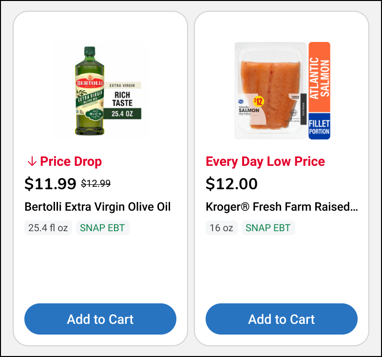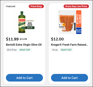 Kroger’s in-store promotional signage was being updated to feature simplified language and new visual treatments for tags like “Price Drop” and “Everyday Low Price.” To maintain a cohesive customer experience, the digital team needed to explore how these changes should be reflected online. While the current digital experience wasn’t broken, there was no clear approach for how the new promotional language and visual treatments would carry through to web and app.