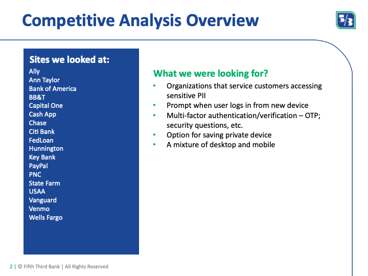 To understand the landscape, I conducted a competitive analysis of 20 financial institutions. I examined both design patterns and the data used for identity verification.